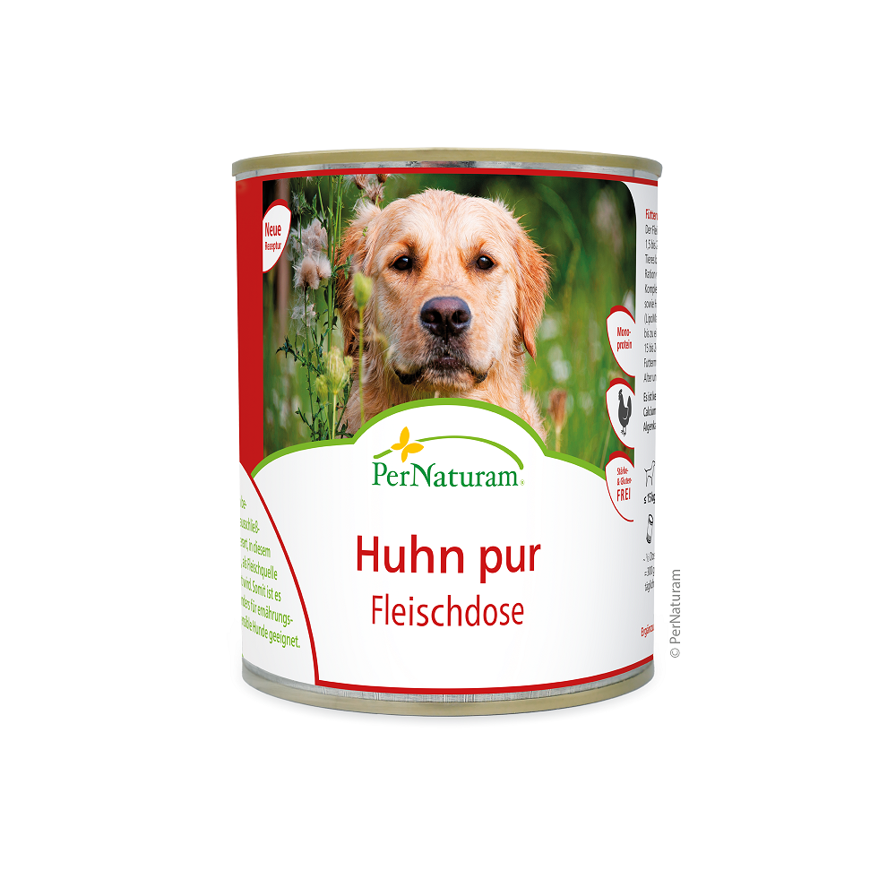 Hühnerfleisch (Muskelfleisch, Herz, Leber) vom Landhuhn 68%, Kartoffelflocken 21% | Zucchini 1,6%, Sellerie 1,3%, Äpfel 1,2%, Fenchel 1,2%, Karotten 1,1%, Pastinaken 0,8%, Leinsamen 0,3%, Rote Beete 0,5% | Eierschalenpulver 0,6%, Bierhefe 0,6%, Distelöl 0,4%, Mineralerde 0,4%, Seealge 0.2% | Hagebutte 0,5%, Liebstöckel 0,1%, Rucola 0,1%, Rosmarin 0,1% | Calcium/Phosphor-Verhältnis 1,3 : 1,0